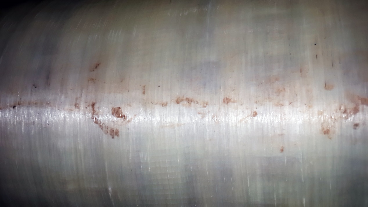 批注:近距離觀察發(fā)現(xiàn)膜的夾層內(nèi)已經(jīng)擠入較多的細(xì)砂,鐵屑,等其他固體顆粒懸浮物,這些固體顆粒一部分來自前端細(xì)砂過濾器,一部分是反滲透沖洗水和清洗系統(tǒng),這些固體顆粒一旦進(jìn)入膜內(nèi)將很難清除,特別是細(xì)砂。